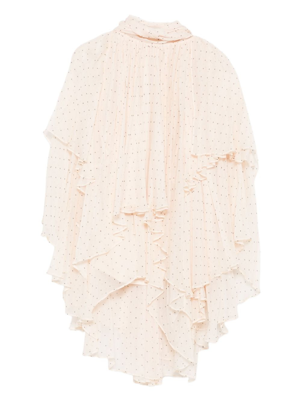 pleated polka-dot blouse Highlights - Cream - Polka dot pattern - Pleated detailing - Layered ruffles - Mock neck Imported Composition Viscose 100% SIZE & FIT Model measurements Height 5 ft 11 in(1.8 m) Bust/Chest 32.67 in(83 cm) Hips 36.22 in(92 cm) Waist 24.4 in(62 cm) Washing instructions Dry Clean Only