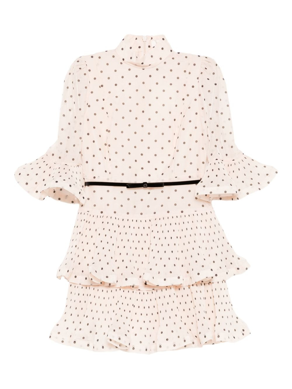 pleated polka dot mini dress Highlights - Beige - Concealed rear zip fastening - Detachable and adjustable waist belt Imported Composition Outer: Polyester 100% Lining: Cotton 100% SIZE & FIT Model measurements Height 5 ft 9 in(1.76 m) Bust/Chest 31.1 in(79 cm) Hips 35.03 in(89 cm) Waist 24.4 in(62 cm) FittingInformation Designed for a close fit at the chest and waist with a loose fit at the hip The belt offers adjustability for fitted preferences Made from a lightweight non-stretch fabric Washing instructions Dry Clean Only