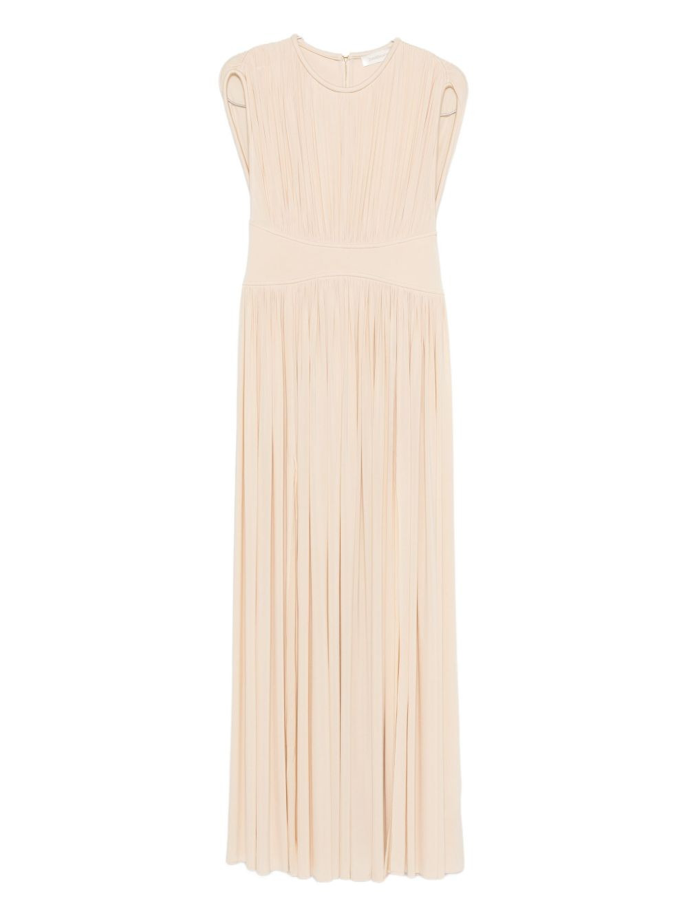 pleated sleeveless midi dress Highlights - Beige - Sleeveless - Round neck - Pleated skirt - Concealed zip fastening Imported Composition Outer: Viscose 90%, Spandex/Elastane 10% Lining: Polyester 90%, Spandex/Elastane 10% Washing instructions Dry Clean Only
