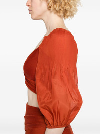 pleated top Highlights - Brick red - Concealed rear zip fastening - Elasticated cuffs - Draped detailing - Half-length sleeves Imported Composition Outer: Polyester 100% Lining: Cotton 100% SIZE & FIT Model measurements Height 5 ft 10 in(1.77 m) Bust/Chest 34.25 in(87 cm) Hips 37.4 in(95 cm) Waist 29.13 in(74 cm) FittingInformation Designed for a close fit throughout Cropped in length Made from a midweight non-stretch fabric