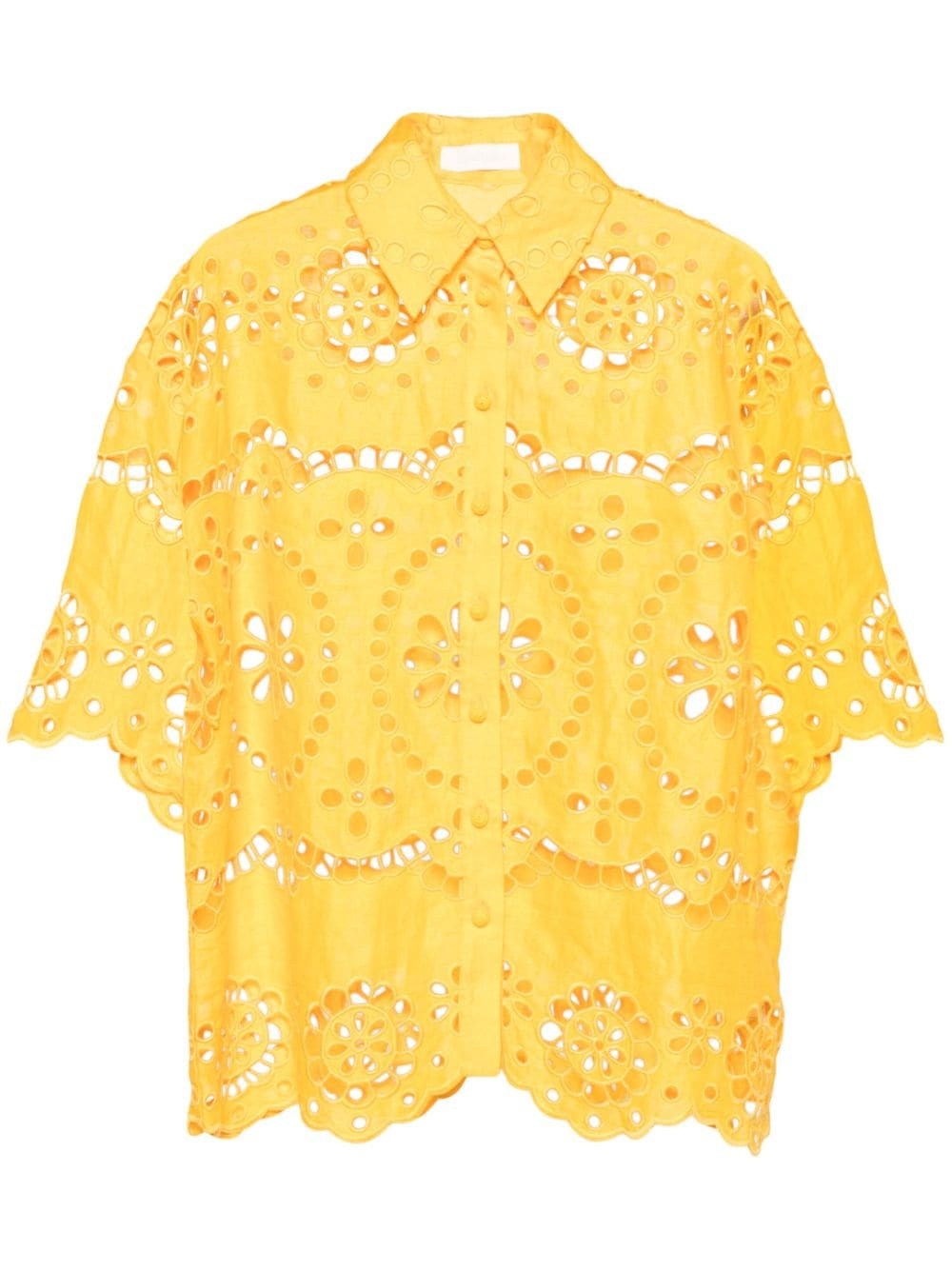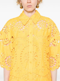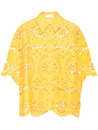 Pop embroidered linen shirt Highlights - Sunflower yellow - Linen - Cut-out floral detailing - Embroidered motif - Straight-point collar - Half-length sleeves - Scallop edge - Front button fastening Imported Composition Polyester 100%, Linen/Flax 100% SIZE & FIT Model measurements Height 5 ft 9 in(1.75 m) Bust/Chest 34.64 in(88 cm) Hips 36.61 in(93 cm) Waist 26.37 in(67 cm) Measurement SLEEVE LENGTH 11.02 in(28 cm) LENGTH 28.74 in(73 cm) WAIST 50.39 in(128 cm) FittingInformation Designed to be unstructured, offering a loose fit throughout The detachable slip sits just away from the body, offering a close yet comfortable fit Made from a midweight non-stretch fabric This piece fits true to size – take your usual size Washing instructions Dry Clean Only