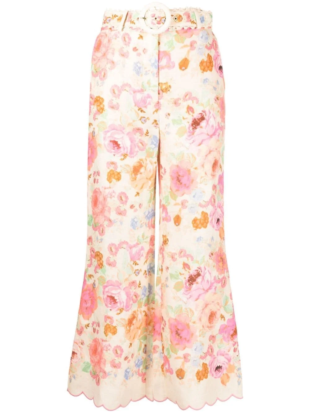 Raie floral-print flared linen trousers ZIMMERMANN's Raie trousers are a prime example of the Australian brand's eclectic and optimistic aura. Crafted from lightweight linen, they boast a retro-inspired flared leg and a statement belt. Hazy, colourful blooms are painted over a muted backdrop, reflecting the house's affinity for floral patterns. Highlights - Light pink/multicolour - Linen/flax - All-over floral print - Flared design - Cropped leg - Detachable belt - Belt loops - Zip fly fastening - Two side slash pockets - Two rear welt pockets - Scallop hem Imported Composition Lining: Cotton 100% Outer: Linen/Flax 100%, Polyester 100% SIZE & FIT Model measurements Height 5 ft 10 in(1.79 m) Bust/Chest 31.49 in(80 cm) Hips 35.03 in(89 cm) Waist 23.62 in(60 cm) FittingInformation Designed with a flared hem, these trousers allow for a close fit at the waist with a slim fit over the leg and widening towards the hem The belt offers adjustability for fitted preferences Made from a lightweight non-stretch fabric This piece fits true to size – take your usual size Washing instructions Dry Clean Only