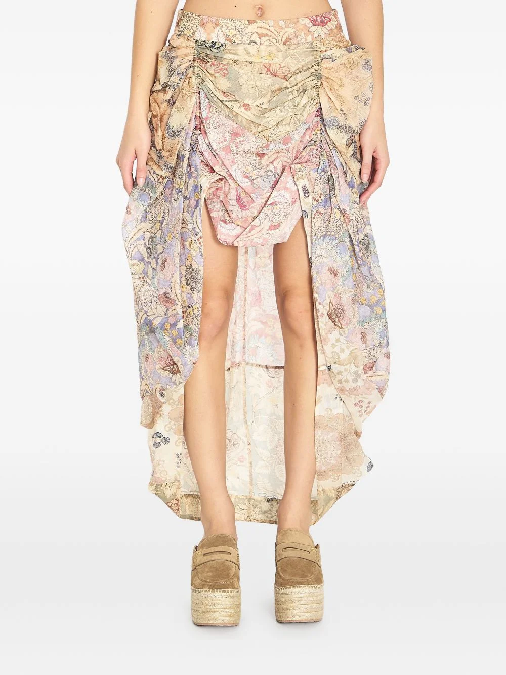 Rebellion floral asymmetric skirt Highlights - Beige and multicolour - Floral print - Asymmetric hem - Concealed zip fastening - Gathering Imported Composition Linen/Flax 55%, Silk 45% Washing instructions Dry Clean Only