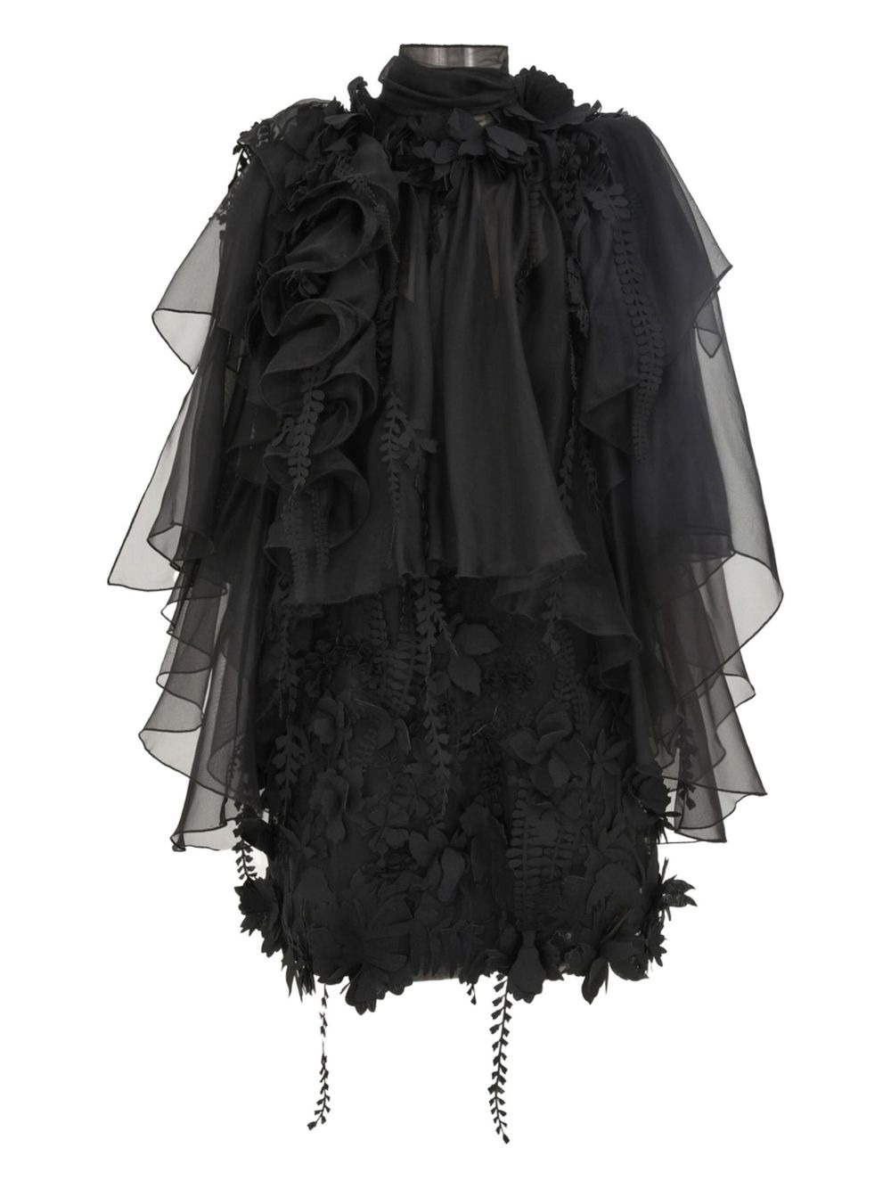 ruffle-applique mini dress Highlights - Black - Cascading ruffles - Laser-cut flower trim - Self-tie neck bow - Rear zip-fastening Imported Composition Silk 100% Washing instructions Read Manufacturer Guidelines