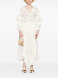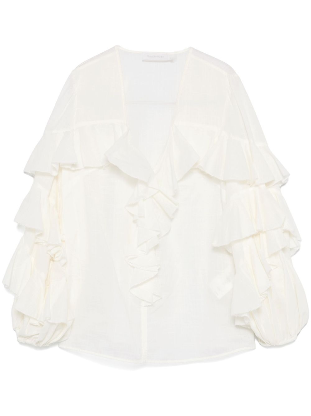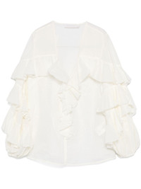 ruffled blouse Highlights - Ivory white - Front button fastening - V-neck - Long sleeves - Elasticated cuffs Imported Composition Cotton 100% SIZE & FIT Model measurements Height 5 ft 9 in(1.75 m) Bust/Chest 34.64 in(88 cm) Hips 36.61 in(93 cm) Waist 26.37 in(67 cm) FittingInformation Designed for a relaxed fit, this piece allows for comfort and movement when worn Made from a midweight non-stretch fabric