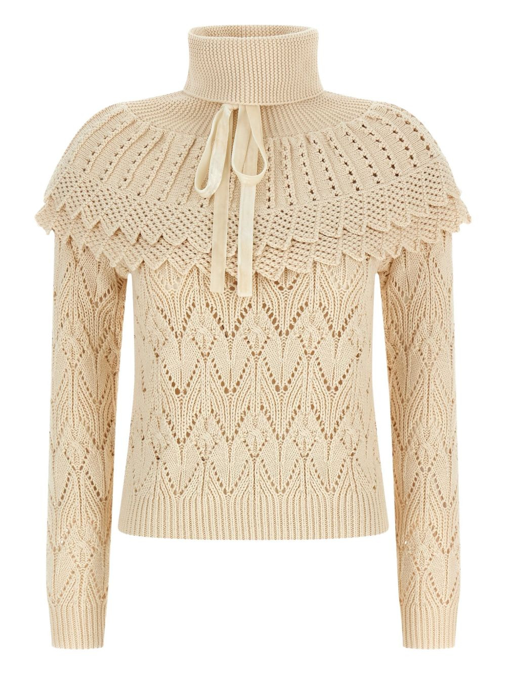 ruffled-collar crocheted sweater Highlights - Beige - Crocheted - Ruffle cape on the shoulders - High collar - Velvet tie - Cuffed sleeves Imported Composition Cotton 92%, Linen/Flax 8% Washing instructions Read Manufacturer Guidelines
