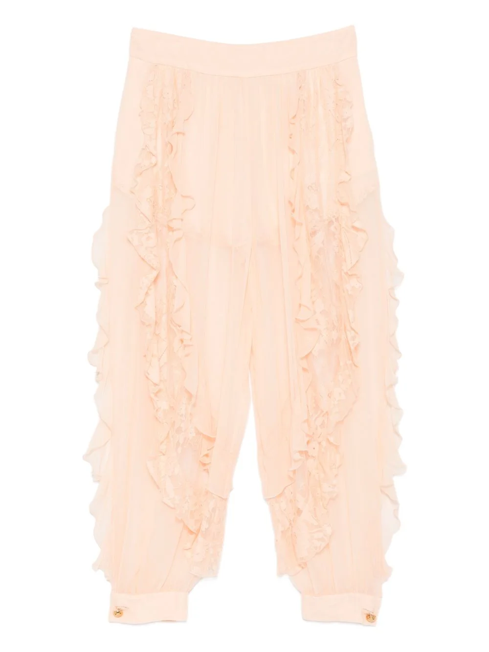 ruffled lace trousers Highlights - Peach - Lace detail - Ruffled trim - Buttoned cuffs - Sheer finish - Elasticated waistband Imported Composition Outer: Polyamide 60%, Cotton 40% Lining: Viscose 100% SIZE & FIT Model measurements Height 5 ft 10 in(1.78 m) Bust/Chest 33.46 in(85 cm) Hips 36.22 in(92 cm) Waist 23.22 in(59 cm) Washing instructions Dry Clean Only