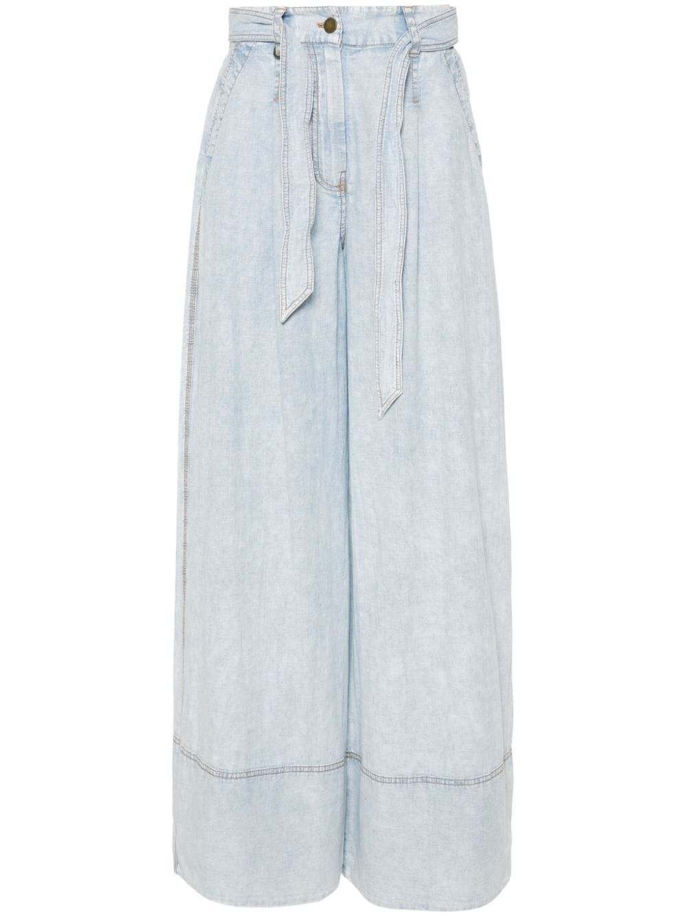 wide-leg cotton jeans Highlights - Light blue - Cotton - Denim - Contrast stitching - Belt loops - Detachable belt - Two diagonal pockets to the sides - Rear welt pocket - Wide leg - Front button and zip fastening Made in United States Composition Lining: Cotton 100% Outer: Cotton 100% SIZE & FIT Model measurements Height 5 ft 9 in(1.76 m) Bust/Chest 31.88 in(81 cm) Hips 35.43 in(90 cm) Waist 24.8 in(63 cm) Measurement FRONT RISE 12.99 in(33 cm) INSIDE LEG 31.49 in(80 cm) HIPS 43.3 in(110 cm) WAIST 25.19 in(64 cm) FittingInformation Designed with a wide leg cut, these jeans allow for a close fit at the waist and offer a loose and roomy fit over the leg The partially elasticated waistband offers increased movement and comfort at the waist Sturdy and hard-wearing, this denim piece offers no stretch This piece fits true to size – take your usual size Washing instructions Machine Wash