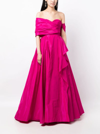 asymmetric off-shoulder silk gown Highlights - Fuchsia pink - Silk - Asymmetric design - Gathered detailing - Draped detailing - Pleat detailing - Off-shoulder - Rear zip fastening - Flared skirt - Floor-length Imported Composition Body: Polyester 100% Lining: Silk 100% SIZE & FIT Model measurements Height 5 ft 10 in(1.77 m) Bust/Chest 28.74 in(73 cm) Hips 35.82 in(91 cm) Waist 24.4 in(62 cm) FittingInformation Designed for a close fit at the chest and waist with a loose fit at the hip The internal bodice offers support and shape Made from a heavyweight non-stretch fabric This piece fits large – take one size down Washing instructions Dry Clean Only