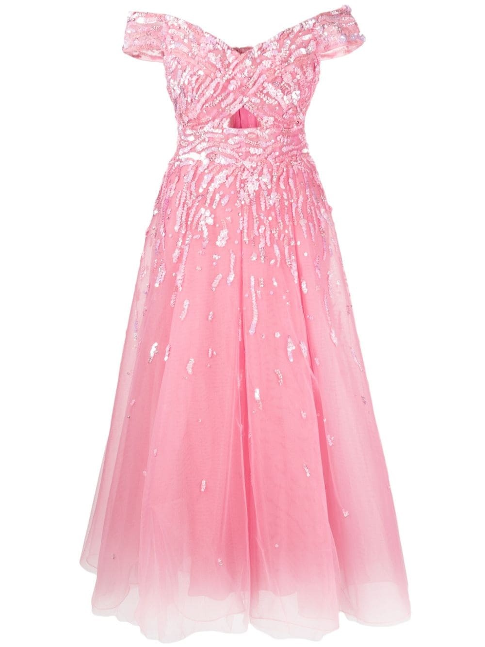 off-shoulder embellished gown Highlights - Light pink - Sequin embellishment - Cut-out detailing - Tulle overlay - Off-shoulder - Rear zip fastening - Pleated skirt - Flared hem - Silk lining - Mid-length Imported Composition Nylon 100% SIZE & FIT Model measurements Height 5 ft 10 in(1.77 m) Bust/Chest 28.74 in(73 cm) Hips 35.82 in(91 cm) Waist 24.4 in(62 cm) FittingInformation Designed for a close fit at the chest and waist with a loose fit at the hip The internal bodice offers support and shape Made from a midweight non-stretch fabric This piece fits true to size – take your usual size Washing instructions Dry Clean Only