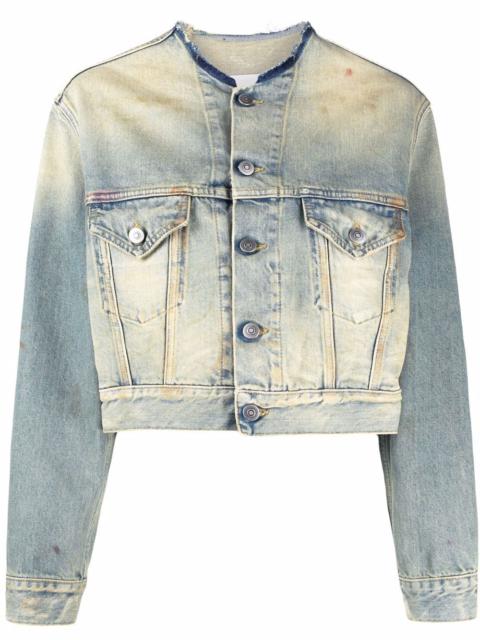 distressed-effect collarless denim jacket