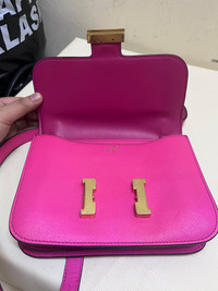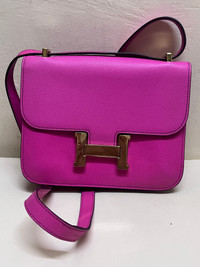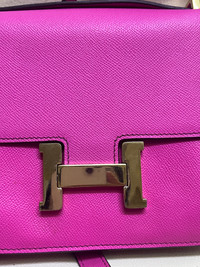 Hermès Constance bag in vibrant fuchsia pink Epsom leather with gold hardware, structured shape and signature H clasp. measurements (common sizes): • Constance 24: 24 × 19 × 5 cm