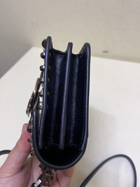 Pinko Mini Love Mix Studs Bag • Black vintage-effect leather • Metal studs + micro-chain details • Top flap with Love Birds buckle • Size: 21 cm W × 12 cm H × 7 cm D • Shoulder strap drop: ~110 cm