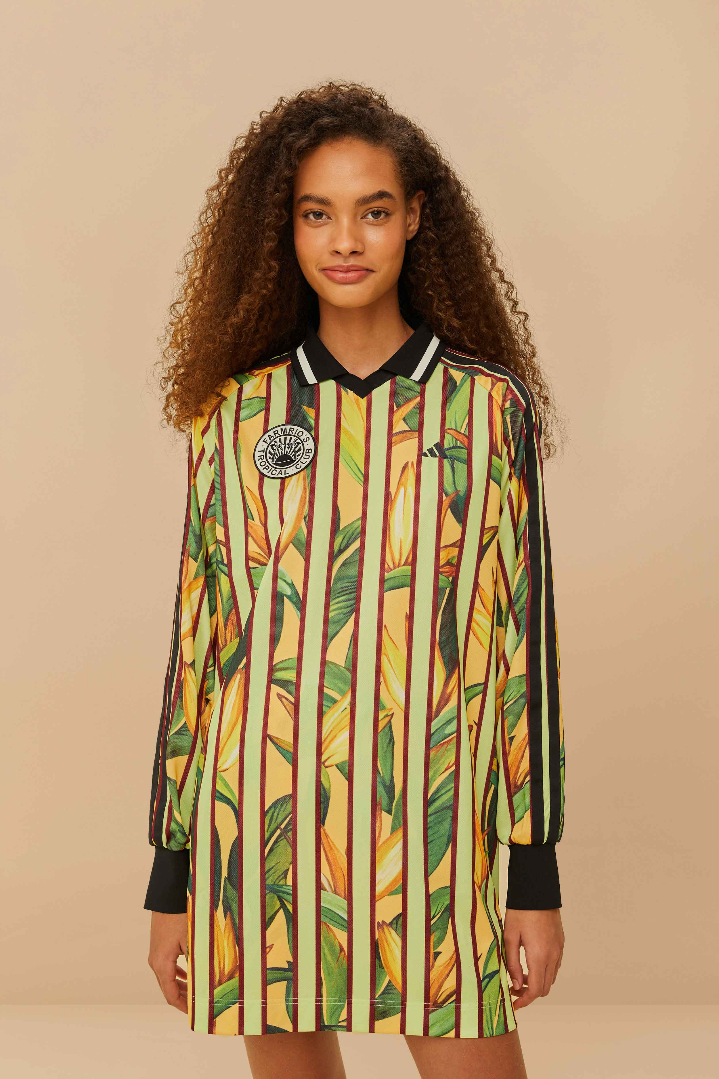 Embrace the vibrant charm of the Adidas Stripes Of Paradise Semi Spark Dress. This playful piece showcases a lively fusion of bold stripes with tropical foliage patterns, enhanced by exquisite embroidery. Crafted from responsible materials, it features long sleeves with contrasting cuffs for a touch of sophistication. Let the playful colors and artistic design transport you to a lush paradise, adding warmth and flair to any occasion. Since 2014, we have been blending our unique prints with the three most famous stripes in the world, connecting Adidas' urban energy with the essence of Brasil. Discover our new Adidas <3 FARM Rio collection, where modern streetwear meets a print lover's paradise, to stand in the sunshine while connecting with your own light. Ref.: sku_JD6284
