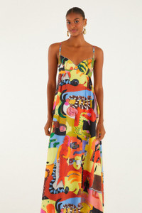 The Ana Leovy Farm Rio Sleeveless Maxi Dress bursts with vibrant colors and playful abstract patterns, creating a joyous celebration of art and nature. Its sweetheart neckline gently frames the decolletage, while the flowing silhouette drapes effortlessly, inviting movement and ease. Delicate, patterned straps add a subtle touch of charm, making this dress a radiant expression of warmth and creativity with every step. - Closure: Invisible Zipper At Center Back - Sleeve type: Sleeveless Ref.: 343336 Composition 60% COTTON 40% VISCOSE Care Instructions MACHINE WASH GENTLE CYCLE, DO NOT BLEACH, DO NOT TUMBLE DRY, LINE DRYING, IRON AT MEDIUM HEAT, DRY CLEAN WITH ANY SOLVENT EXCEPT TRICHLOROETHYLENE Fabric origin: Turkey Product manufacturing: Turkey Product printing: Turkey