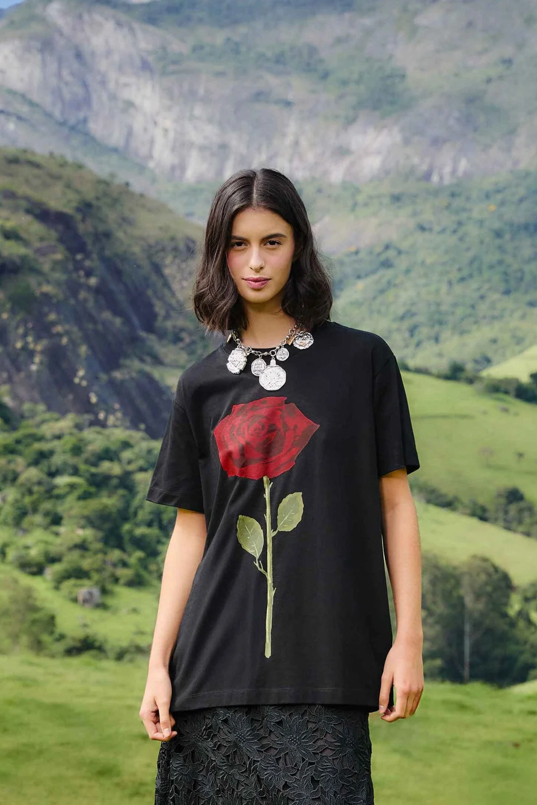 Embrace effortless charm with the Black Rose Organic Cotton Relaxed T-Shirt from FARM Rio. Crafted from 100% certified organic cotton, its soft, eco-friendly fabric feels gentle on the skin. The relaxed silhouette and classic round neckline create a comfortable, laid-back vibe, while the striking, oversized red rose print adds a bold, poetic touch. This top invites you to wear a whisper of nature's beauty wherever you go.- Sleeve type: Short Sleeve Ref.: 346292 Composition 100% COTTON Care Instructions MACHINE WASH GENTLE CYCLE, DO NOT BLEACH, DO NOT TUMBLE DRY, LINE DRYING, IRON AT MEDIUM HEAT, DRY CLEAN WITH ANY SOLVENT EXCEPT TRICHLOROETHYLENE Fabric origin: Turkey Product manufacturing: Turkey Product printing: Turkey