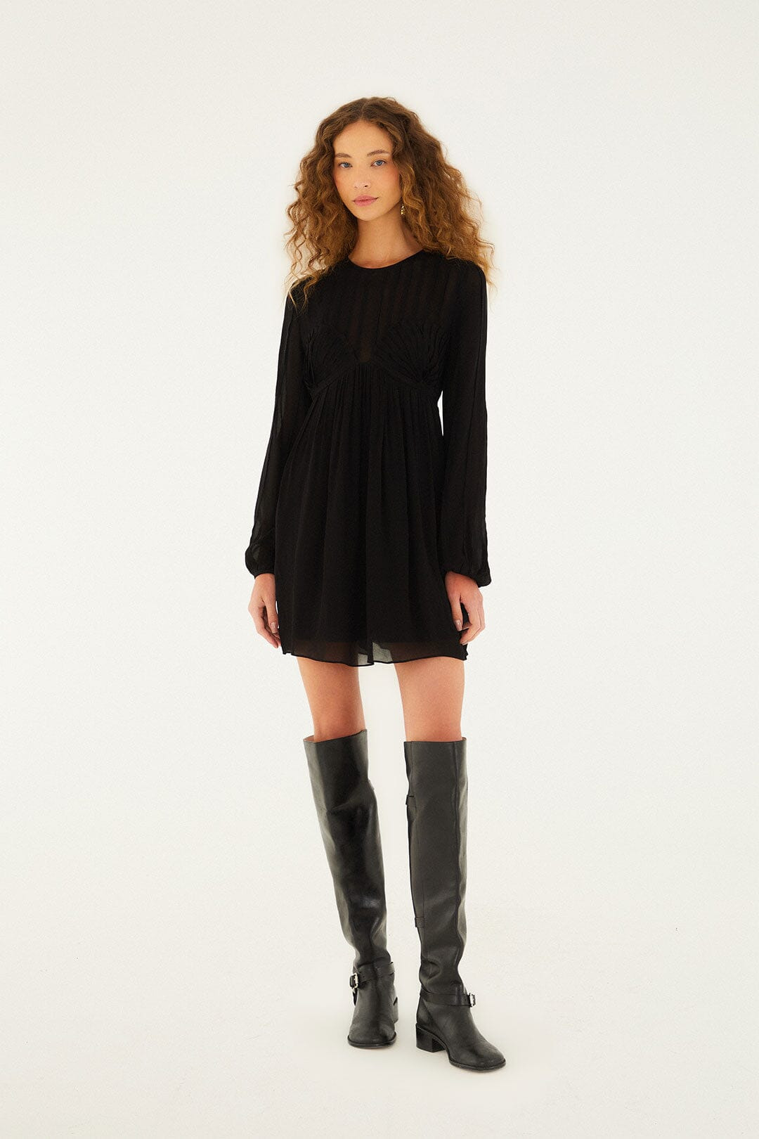 The Black Shell Mini Dress from FARM Rio captivates with its ethereal flow and elegant black hue. Featuring a round neckline and long, billowy sleeves, it embraces a delicate sheer fabric layered over a softly pleated bodice that mimics a shell shape. The gathered skirt flares gently, creating a playful silhouette that moves with grace. This dress is a poetic balance of sophistication and spirited charm, perfect for an effortless statement. - Closure: Invisible Zipper At Side Seam - Sleeve type: Long Sleeve Ref.: 351984 Composition 100% VISCOSE Care Instructions WASH WITH SIMILAR COLOURS, DO NOT BLEACH, TUMBLE DRY LOW, IRON ON REVERSE, DRY CLEAN ONLY Fabric origin: India Product manufacturing: India Product printing: India