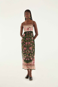 Step into a blooming paradise with the Green Flowering Garden Tree Sleeveless Midi Dress. This enchanting piece showcases a square neckline and delicate braided straps, framing the shoulders with effortless grace. The dress flows in a relaxed silhouette, adorned with lush floral patterns in pink and green hues that evoke a whimsical garden stroll. Its midi length and intricate botanical borders invite warmth and playfulness into every moment.- Sleeve type: Sleeveless Ref.: 343496 Composition 100% VISCOSE Care Instructions MACHINE WASH GENTLE CYCLE, DO NOT BLEACH, DRY FLAT, IRON AT MEDIUM HEAT, DO NOT DRY CLEAN Fabric origin: China Product manufacturing: China Product printing: China