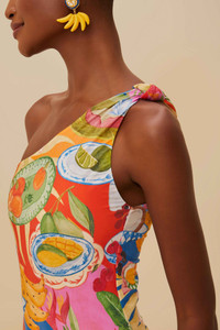 Embrace the vibrant allure of the Multicolor Summer Picnic One-Piece Swimsuit from FARM Rio. This uniquely captivating one-shoulder piece showcases a lively picnic-inspired print bursting with colorful fruits and tropical motifs. The playful, asymmetrical silhouette offers an effortlessly chic look, while the artistic design embodies the essence of sun-kissed joy. Perfect for adding a splash of Brazilian sunshine to your wardrobe. - Sleeve type: Sleeveless Ref.: sku_336741 Composition 75,5% POLYAMIDE 24,5% ELASTANE Care Instructions MAXIMUM WASHING TEMPERATURE 30°, MILD PROCESS, DO NOT BLEACH, TUMBLE DRYING POSSOBLE, DO NOT IRON, DO NOT DRY CLEAN
