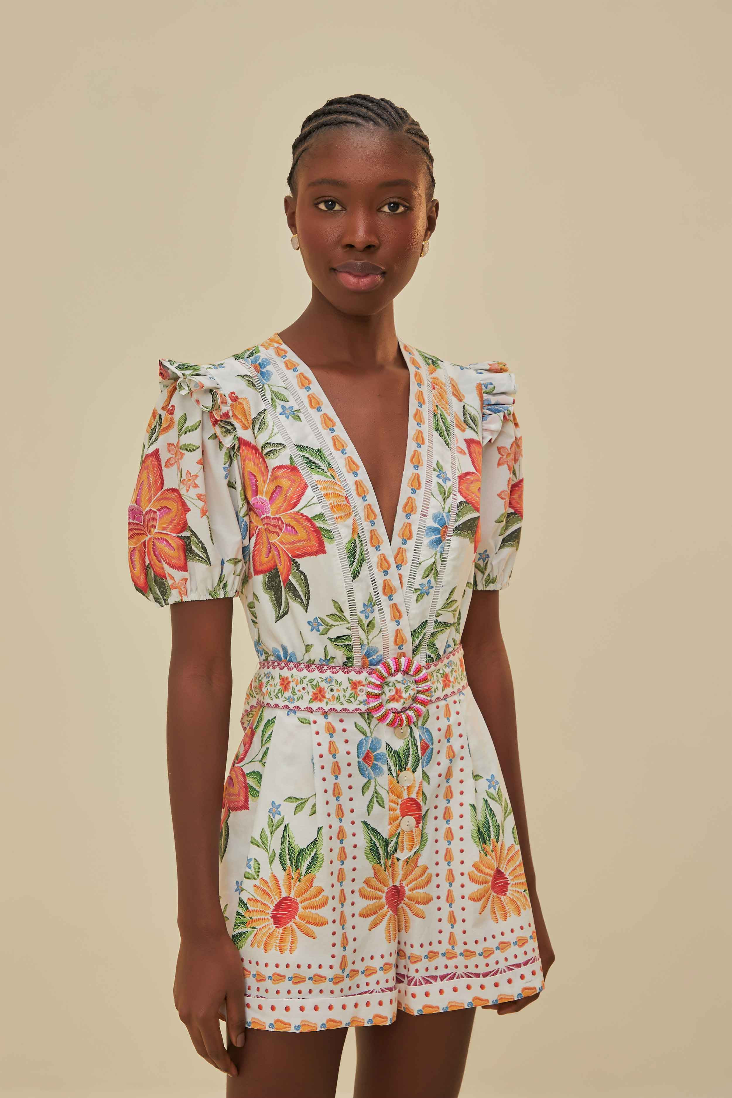 Embrace the allure of nature with the Off-White Bloom Garden Romper. This charming ensemble showcases a flirtatious sweetheart neckline, flutter sleeves, and a cinched waist, complemented by vivacious floral prints. Crafted from sustainable ECOVERO™ fibers, it features a play of eyelet lace and vibrant, handcrafted beaded embellishments that add a whimsical touch to your wardrobe. Its unique silhouette and pattern exude a carefree spirit, perfect for sun-soaked days. Ref.: sku_331187 Composition 100% COTTON Care Instructions MACHINE WASH ON DELICATE CYCLE, DO NOT BLEACH, DRY FLAT, IRON AT MEDIUM HEAT, DO NOT DRY CLEAN Fabric origin: Turkey Product manufacturing: Turkey Product printing: Turkey