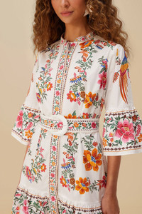 Embrace the enchanting allure of the off-white delicate forest scarves organic cotton mini dress. This charming piece captivates with its playful mix of vibrant forest-inspired patterns and softly draping silhouette. The high neckline adds an elegant touch, perfectly framing the face. Crafted from responsible materials, its soft texture provides a gentle embrace. This mini dress is perfect for those sun-drenched days, effortlessly blending nature's beauty with timeless style. - Closure: Center front buttons - Button type: Plastic button - Sleeve type: Elbow lenght sleeve GOTS-certified organic cotton has a lower environmental impact than conventional cotton, as it reduces water usage, greenhouse gas emissions, and the amount of chemicals used. Ref.: sku_335967 Composition 100% COTTON Care Instructions MACHINE WASH GENTLE CYCLE, DO NOT BLEACH, DO NOT TUMBLE DRY, LINE DRYING, IRON AT LOW HEAT, DRY CLEAN WITH ANY SOLVENT EXCEPT TRICHLOROETHYLENE Product manufacturing: CHINA Product printing: CHINA