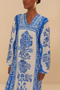 Embrace a timeless elegance with the Off-White Delicate Tapestry Long Sleeve Maxi Dress from FARM Rio. This enchanting piece features a gentle V neckline and showcases an intricate tapestry of blue floral motifs against a soft white canvas. Its flowing silhouette and voluminous sleeves create a romantic, breezy look. Perfect for adding a touch of whimsy to any occasion, this dress effortlessly combines tradition with modern flair. Ref.: sku_335730 Composition 100% COTTON Care Instructions MACHINE WASH GENTLE CYCLE, DO NOT BLEACH, TUMBLE DRY LOW, IRON AT LOW HEAT, DO NOT DRY CLEAN Product manufacturing: INDIA Product printing: INDIA