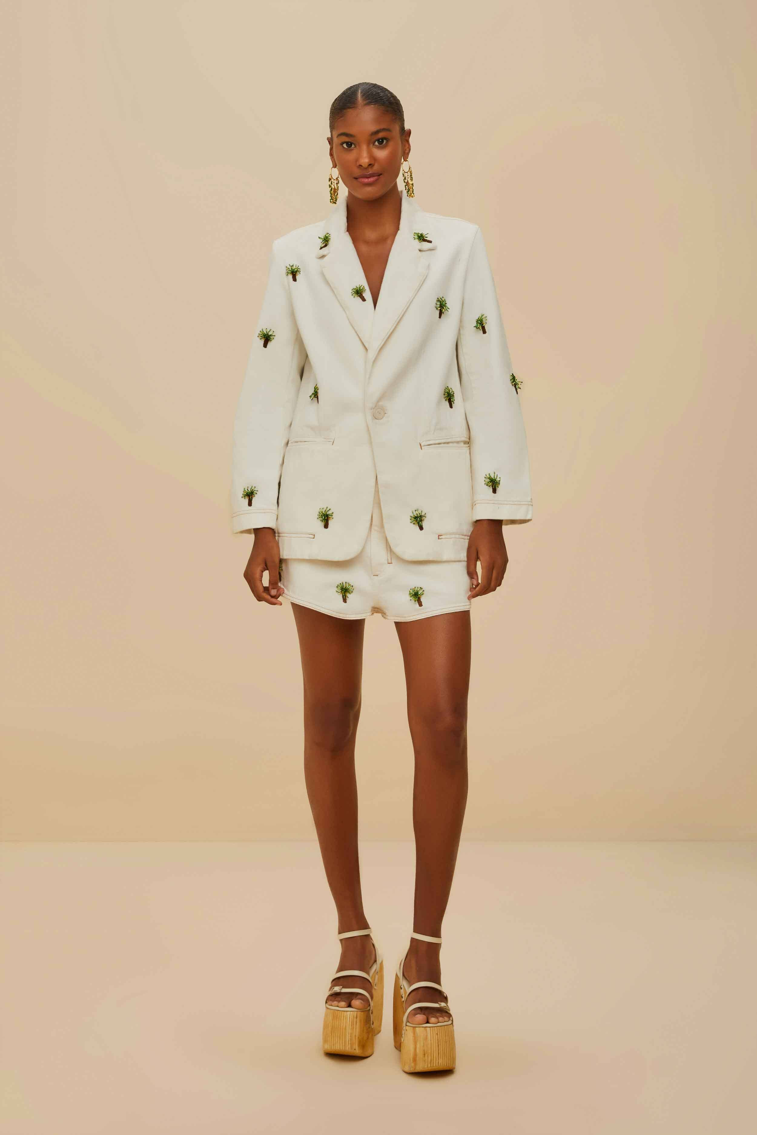 Embrace the breezy charm of summer with the off-white embroidered coconut tree shorts by FARM Rio. Crafted from responsible materials, these playful shorts feature delightful coconut tree embroidery that dances across the fabric. The relaxed silhouette and soft hue evoke a sense of warmth and ease, perfect for sun-soaked adventures. Each stitch tells a story of tropical coziness, inviting you to celebrate the joy of nature in style. - Closure: #n/a - Button type: #n/a - Fly: #n/a - Pockets: #n/a - Leg fit: #n/a - Sleeve type: #n/a Farm Rio Ref.: sku_346953
