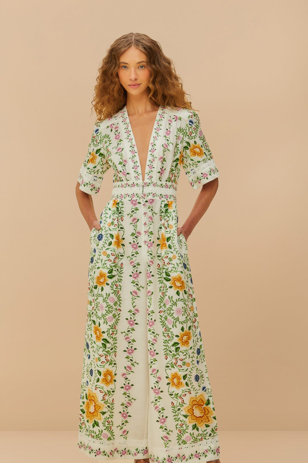 Embrace the charm of nature with our Off-White Folk Floral Lenzing™ Ecovero™ Euroflax™ Jumpsuit. This piece features a playful V neckline and captivating floral patterns in vibrant hues. The relaxed silhouette is adorned with intricate embroidery, offering a soft touch of elegance. Made with responsible materials, this jumpsuit wraps you in comfort and style, perfectly embodying FARM Rio's signature warmth and playful spirit. LENZING™ ECOVERO™: the eco-responsible fibers generate up to 50% lower emissions and water impact compared to generic viscose. FARM Rio Ref.: sku_332952 Composition 55% LINEN 45% VISCOSE Care Instructions MACHINE WASH GENTLE CYCLE, DO NOT BLEACH, DO NOT TUMBLE DRY, LINE DRYING, IRON AT LOW HEAT, CRY CLEAN WIH ANY SOLVENT EXCEPT TRICHLOROETHYLENE Product manufacturing: CHINA Product printing: CHINA
