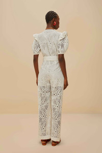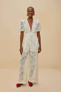 Step into effortless elegance with the Off-White Palm Tree Eyelet Jumpsuit by FARM Rio. Featuring intricate eyelet patterns that dance with palm tree motifs, this jumpsuit boasts a charming V neckline and playful puff sleeves. The fitted waist, adorned with a matching belt, flows into wide-leg trousers, creating a silhouette that is both nostalgic and refreshingly modern. Perfect for those sun-soaked days and warm, breezy nights. - Closure: Center front buttons - Button type: Plastic button - Fly: Functional - Leg fit: Straight - Sleeve type: Short sleeve Ref.: sku_336442 Composition 100% COTTON Care Instructions HAND WASH SEPARATELY, DO NOT BLEACH, DO NOT TUMBLE DRY, DRY FLAT, IRON AT LOW HEAT, DRY CLEAN WITH ANY SOLVENT EXCEPT TRICHLOROETHYLENE Product manufacturing: CHINA Product printing: CHINA
