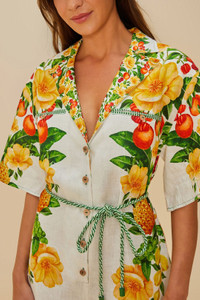 Embrace a touch of paradise with the Off-White Picnic Flowers Euroflax™ Premium Linen Romper. Crafted from responsible materials, this playful piece features a vibrant floral print that dances across the crisp linen canvas. The collar neckline adds a classic touch, while wide sleeves and a cinched waist create an effortlessly chic silhouette. The enchanting blend of colors and patterns brings warmth and joy to any occasion. - Closure: Center front buttons - Button type: Plastic button - Leg fit: Straight - Sleeve type: Short sleeve LENZING™ ECOVERO™: the eco-responsible fibers generate up to 50% lower emissions and water impact compared to generic viscose. Ref.: sku_336647 Composition 100% LINEN Care Instructions HAND WASH SEPARATELY, DO NOT BLEACH, DO NOT TUMBLE DRY, DRY FLAT, IRON AT LOW HEAT, DRY CLEAN WITH ANY SOLVENT EXCEPT TRICHLOROETHYLENE Product manufacturing: CHINA Product printing: CHINA