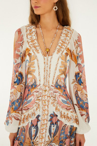 Embrace effortless charm with the Off-White Sea Garden Ruffled Maxi Dress by FARM Rio. Featuring a delicate V neckline and a flowing silhouette, this dress dances with playful ruffles cascading along the skirt. Its off-white canvas is adorned with vibrant, tropical floral patterns, evoking the warmth of a sunlit garden. Light and breezy, it’s a celebration of joyful movement and timeless Brazilian elegance. - Closure: Invisible Zipper At Center Back - Button type: Metal Buttons - Sleeve type: Long Sleeve Ref.: 359252 Composition 100% VISCOSE Care Instructions MACHINE WASH, GENTLE CYCLE, DO NOT BLEACH, DO NOT TUMBLE DRY, LINE DRY IN THE SHADE, IRON AT LOW HEAT, DO NOT DRY CLEAN Fabric origin: India Product manufacturing: India Product printing: India