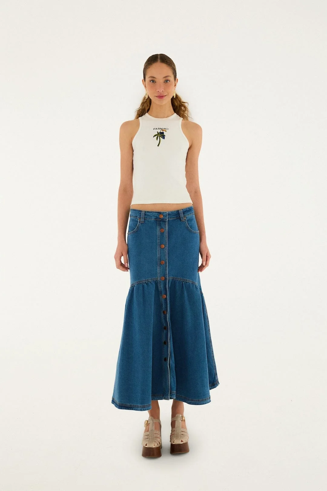 Embrace effortless charm with the Panelled Denim Long Skirt by FARM Rio. Its artful patchwork of rich indigo hues and subtle fading creates a dynamic, textured look that dances with every step. The flowing A-line silhouette gently sways, adding a playful movement that feels both free and grounded. Perfectly blending classic denim with Brazilian spirit, this skirt invites warmth and vibrant energy into your everyday style. Ref.: 368235