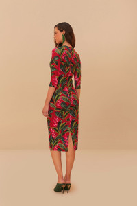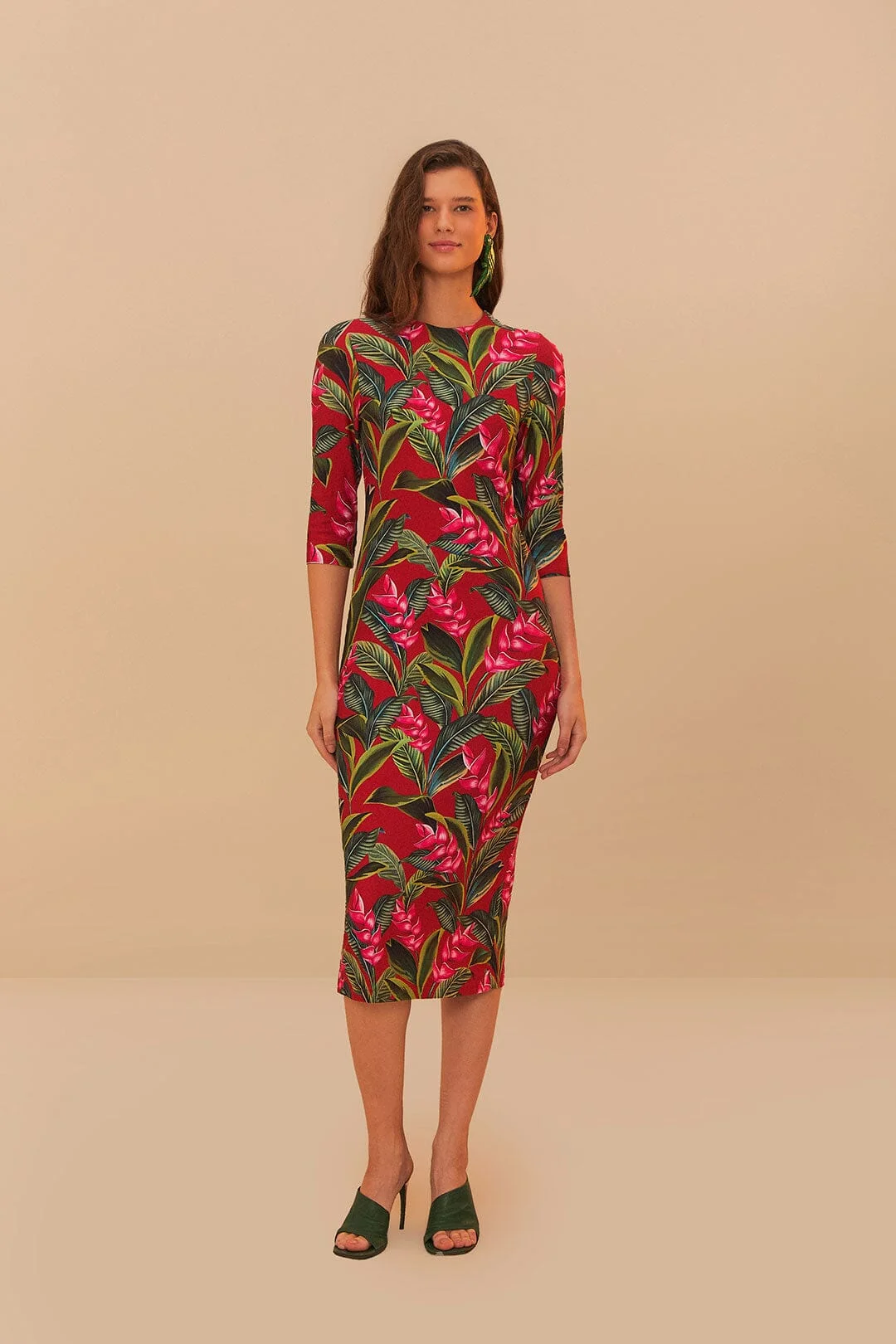 Embrace vibrant elegance with the Red Dream Garden Jersey Midi Dress by FARM Rio. Featuring a captivating tropical print of lush green leaves and vibrant pink flowers, this dress offers a playful escape into nature. The round neckline and three-quarter sleeves deliver a classic silhouette, while the soft jersey fabric flatters and flows with every step. Perfect for adding a touch of exotic flair to your everyday style. Ref.: sku_337800 Composition 95% VISCOSE 5% ELASTANE Care Instructions MACHINE WASH GENTLE CYCLE, DO NOT BLEACH, DO NOT TUMBLE DRY, LINE DRYING, IRON AT LOW HEAT, DRY CLEAN WITH ANY SOLVENT EXCEPT TRICHLOROETHYLENE Product manufacturing: TURKEY Product printing: TURKEY