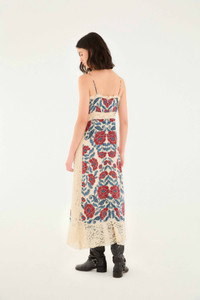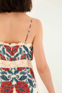 The Sand Francesca Midi Dress charms with its flowing silhouette and delicate V neckline. Crafted in a palette of soft sand tones enriched by bold red and blue floral prints, this dress features intricate lace inserts that trace the waist, skirt sides, and hem, imparting a feminine texture. The slender straps and lace trim at the bust add a touch of vintage romance, weaving warmth and playful elegance into every wear. - Closure: Invisible Zipper At Center Back - Sleeve type: Sleeveless Ref.: 346062 Composition 100% VISCOSE Care Instructions MACHINE WASH GENTLE CYCLE, DO NOT BLEACH, DO NOT TUMBLE DRY, LINE DRY, LOW IRON, DO NOT DRY CLEAN Fabric origin: India Product manufacturing: India Product printing: India