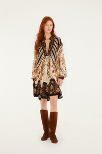 Step into a whimsical garden with the Sand Majestic Garden Lace Long Sleeve Mini Dress from FARM Rio. Its delicate lace fabric blossoms in soft sand tones, wrapping you in a romantic high neckline and airy long sleeves. The playful silhouette flows effortlessly above the knee, while intricate floral patterns add a touch of handcrafted charm. Perfect for those who cherish elegance blended with a joyful, free-spirited vibe. - Closure: Invisible Zipper At Side Seam - Button type: Plastic Button - Sleeve type: Long Sleeve Ref.: 343974 Composition 100% VISCOSE Care Instructions MACHINE WASH GENTLE CYCLE, DO NOT BLEACH, DO NOT TUMBLE DRY, LINE DRYING IN SHADE , IRON AT LOW HEAT, DO NOT DRY CLEAN Fabric origin: India Product manufacturing: India Product printing: India
