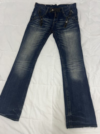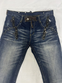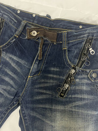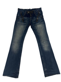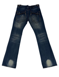 SEMANTIC DESIGN DENIM FLARE JEANS LEATHER TRIMMED Chain zipper pocket style Good condition 9.5/10 Size 33”