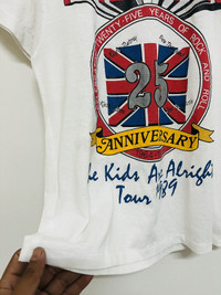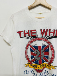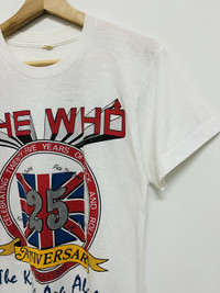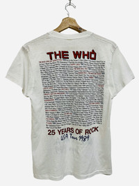 Vintage 1989 The Who 25th Anniversary Tour Concert T-Shirt On back the print features all the songs released by the band in commemoration of the band’s 25 Years of Rock Anniversary Has been altered on the left and right sides as well as on the bottom of the shirt to be minimized Tag on this shirt is missing Item in good condition 9/10 pls refer picture carefully Used