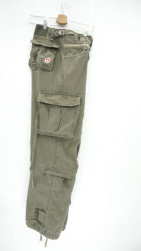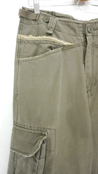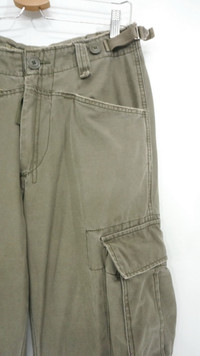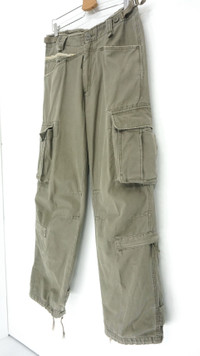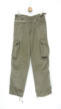 Item will be re-laundered for disinfectant and will be handled hygienically before ship out. COMBINED SHIPPING is available for a great money-time saving. ............................ Vintage Japan Military Parachute Style Bondage Cargo Pants Dusty army green ............................. Measurement (Inches): Waist: Recommended 30-32” (adjustable waist comes with sidetab) Length: 42” Inseam: 31.5” Front rise: 12.5" Thigh: 11” Back rise: 14.5” Hip: 44” Knee: 10.5” Leg Opening: 10” (adjustable with velcro strap) ............................. Good used condition. Signs of wear. Some soft mark and faded spots. Fixed/reworked on the main button. Ripped both leg opening (see last photo) 100% cotton Weight: 980g / 34.5oz ............................. ➤ Please CHECK measurement & photos CAREFULLY. ➤ All sales are FINAL, No Return or Refund. ➤ Prepare & ship out within 1-3 working days via DHL Express (Estimated delivery 4 - 8 working days) ➤ Your contact number is required for shipping purposes. Buy with confidence, feel free to offer Thank you