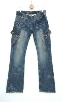 Item will be re-laundered for disinfectant and will be handled hygienically before ship out. COMBINED SHIPPING is AVAILABLE for a great money-time SAVING on MULTIPLE items purchase. ............................ DAILY NEWS Japanese Distressed Flared Cargo Jeans Cool rivets design. ............................ Measurement (Inches): Waist: Recommended 32" (Tag 32) Outseam: 43” Inseam: 31.5" Front rise: 9" Thigh: 10” Back rise: 12” Hip: 40” Knee: 7.5" Leg opening: 9" ............................ Good used vintage condition. Signs of wear. Stained and ripped leg opening. See all photos. 100% Cotton Weight: 850g ............................ ➤ Please CHECK measurement & photos CAREFULLY. ➤ All sales are FINAL, No Return or Refund. ➤ Prepare & ship out within 1-3 working days via DHL (Estimated delivery in 4 - 8 working days) ➤ Your contact number is required for shipping purposes. ............................ Buy with confidence, feel free to offer Thank you.