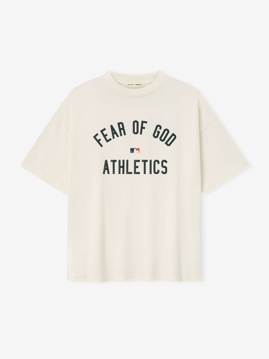 The Athletics 90s Tee is cut from 100% cotton jersey, offering a soft yet substantial hand feel. Designed in an oversized 90s-inspired silhouette, it features exaggerated proportions with dropped shoulders for a relaxed drape. The front is defined by a bold puffer-print application of the "Fear of God Athletics" lockup, alongside the MLB insignia. Across the back, an Athletics logo anchors the piece with the signature rubberized Fear of God Essentials label at the collar. Size Note: size down for a classic fit DETAILS - 100% COTTON JERSEY, 220GSM - ESSENTIALS 90s FIT - OVERSIZED BODY AND SLEEVES - FEAR OF GOD ATHLETICS GRAPHIC - MLB LOGO - ATHLETICS LOGO - CLASSIC RIB-KNIT COLLAR - FEAR OF GOD ESSENTIALS RUBBERIZED LABEL AT BACK COLLAR - IMPORTED