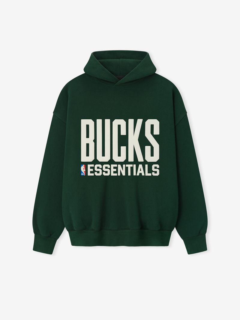 The Bucks Sport Hoodie is crafted from core fleece, offering an elevated balance of softness, structure, and lasting comfort. Cut in a relaxed sport fit, it drapes with more ease through the body and extended length compared to the Essentials classic silhouette. The front features a bold puffer-print graphic "Bucks Essentials " alongside the authentic NBA logo, while the back showcases the official Milwaukee Bucks graphic logo. Additional features include side pockets, rib-knit at the cuffs and waist hem. The signature rubberized Fear of God Essentials label accents the hood. DETAILS - 80% COTTON / 20%POLYESTER FLEECE - ESSENTIALS SPORT FIT: RELAXED, CROPPED - BUCKS ESSENTIALS LOCKUP - NBA LOGO - BUCKS GRAPHICLOGO - FEAR OF GOD LABEL - SIDE POCKETS - ELASTIC BINDING AT CUFF AND WAIST HEM - IMPORTED