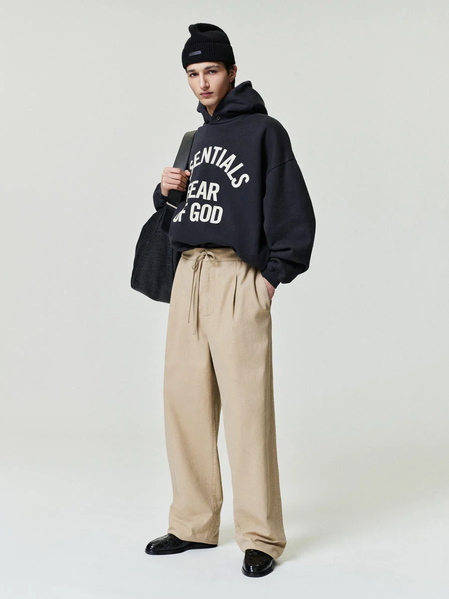 The Pleat Front Pant is made from a canvas that offers workwear-inspired modern style. This pant features a relaxed leg fit shaped by a front pleat, side pockets, and an encased elastic waistband with drawstrings. An Essentials signature label at the back pocket completes the look.