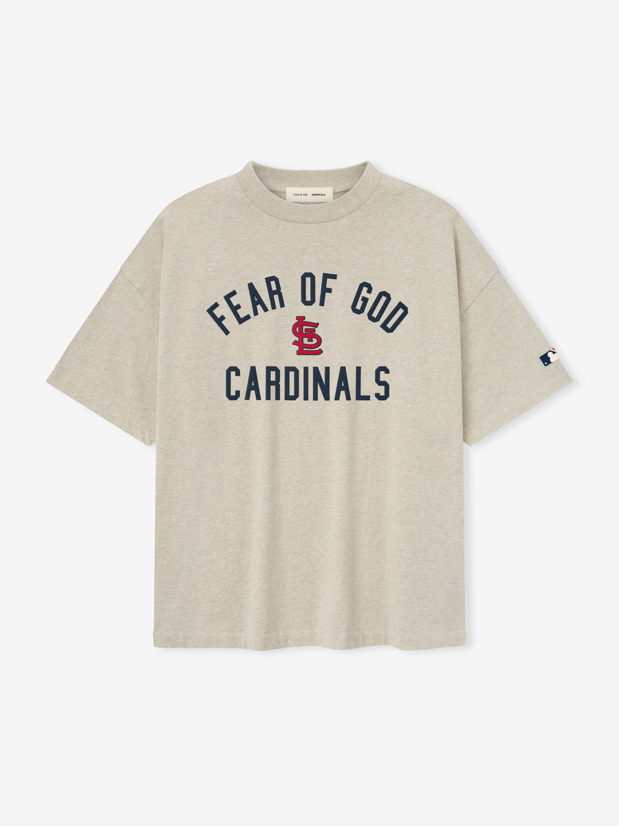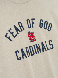 The Cardinals 90s Tee is cut from 100% cotton jersey, offering a soft yet substantial hand feel. Designed in an oversized 90s-inspired silhouette, it features exaggerated proportions with dropped shoulders for a relaxed drape. The front is defined by a bold puffer-print application of the "Fear of God Cardinals" lockup, alongside the MLB insignia on the sleeve. Across the back, an official St. Louis logo anchors the piece with the signature rubberized Fear of God Essentials label at the collar. Size Note: size down for a classic fit DETAILS - 100% COTTON JERSEY, 220GSM - ESSENTIALS 90s FIT - OVERSIZED BODY AND SLEEVES - FEAR OF GOD CARDINALS GRAPHIC - MLB LOGO - ST. LOUIS LOGO - CLASSIC RIB-KNIT COLLAR - FEAR OF GOD ESSENTIALS RUBBERIZED LABEL AT BACK COLLAR - IMPORTED