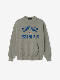 The Cubs Sport Crewneck is crafted from core fleece, offering an elevated balance of softness, structure, and lasting comfort. Cut in a relaxed sport fit, it drapes with more ease through the body and extended length compared to the Essentials classic silhouette. The front features a bold puffer-print graphic reading “Chicago Essentials” alongside the MLB insignia, while the back is finished with the official Cubs logo. Additional details include a kangaroo pocket, rib-knit collar, cuffs and hem. The signature rubberized Fear of God Essentials label accents the back. DETAILS - 80% COTTON / 20%POLYESTER FLEECE - ESSENTIALS SPORT FIT: RELAXED, CROPPED - CHICAGO ESSENTIALS + MLB LOGO - CUBS LOGO - FEAR OF GOD LABEL - KANGAROO POCKET - ELASTIC BINDING AT COLLAR, CUFF AND WAIST HEM - IMPORTED