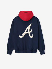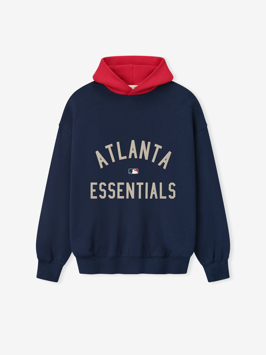 The Fear of God Essentials Braves hoodie is made from core fleece providing a relaxed fit and cropped silhouette. The front showcases a puffer print "Atlanta Essentials" art with the iconic MLB logo. The back is branded with the Atlanta Braves "A" logo. Additional features include a contrasting double-layered hood, side seam pockets, elastic bindings at the cuffs and waist hem, and a rubberized Fear of God Essentials label is attached on the hood. DETAILS - 80% COTTON / 20% POLYESTER HEAVYWEIGHT FLEECE - ESSENTIALS MODERN FIT - CROPPED, VOLUMINOUS BODY, SLEEVES - PUFFER PRINT ATLANTA ESSENTIALS GRAPHIC AND MLB LOGO - ATLANTA "A" LOGO - ESSENTIALS FEAR OF GOD RUBBERIZED LABEL ON THE HOOD - CONTRASTING DOUBLE LAYERED HOOD - ELASTIC BINDING AT CUFF AND TAPERED WAISTBAND - IMPORTED