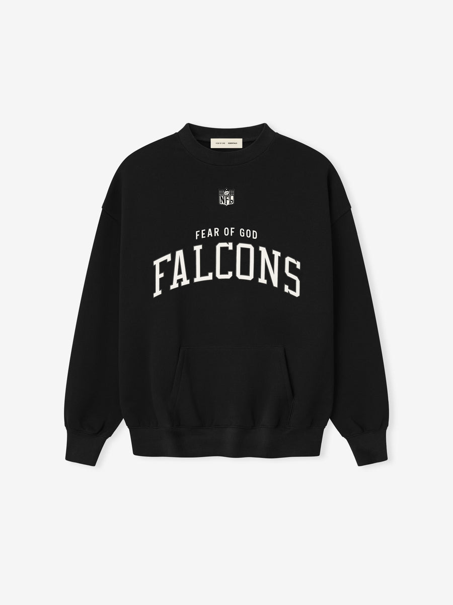 The Fear of God Essentials Falcons Crewneck is made from core fleece and features a modern fit for a relaxed, cropped silhouette. The front showcases a puffer print with the "Fear of God Falcons" lockup, along with the iconic NFL logo. On the back, you'll find the primary Atlanta Falcons logo. Additional details include side seam pockets, and rib-knit bindings at the collar, cuffs, waist hem, and a rubberized Fear of God Essentials label is attached at the back collar. DETAILS - 80% COTTON / 20% POLYESTER HEAVYWEIGHT FLEECE - ESSENTIALS MODERN FIT - CROPPED, VOLUMINOUS BODY, SLEEVES - PUFFER PRINT ATLANTA ESSENTIALS GRAPHIC AND NFL LOGO - FALCON LOGO - ESSENTIALS FEAR OF GOD RUBBERIZED LABEL - ELASTIC BINDING AT COLLAR, CUFF AND TAPERED WAISTBAND - IMPORTED