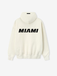 The Heat Sport Hoodie is crafted from core fleece, offering an elevated balance of softness, structure, and lasting comfort. Cut in a relaxed sport fit, it drapes with more ease through the body and extended length compared to the Essentials classic silhouette. The front features a bold puffer-print graphic "Heat Essentials " alongside the authentic NBA logo, while the back showcases the "Miami" logo. Additional features include side pockets, rib-knit at the cuffs and waist hem. The signature rubberized Fear of God Essentials label accents the hood. DETAILS - 80% COTTON / 20%POLYESTER FLEECE - ESSENTIALS SPORT FIT: RELAXED, CROPPED - HEAT ESSENTIALS LOCKUP - NBA LOGO - MIAMI LOGO - FEAR OF GOD LABEL - SIDE POCKETS - ELASTIC BINDING AT CUFF AND WAIST HEM - IMPORTED