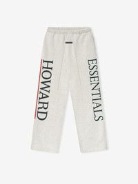 The Howard University Lounge Sweatpant is crafted from 380gsm core fleece, offering both structure and body to its voluminous wide-leg silhouette. One leg features a bold ESSENTIALS print, while Howard University logo accents the other. Finishing details include an encased elastic waistband with elongated drawcords, side seam pockets, and a Fear of God Essentials rubberized label stitched at the center front. DETAILS - 80%COTTON / 20% POLYESTER FLEECE, 380GSM - LOUNGE FIT - WIDE LEG AND SEAT - ESSENTIALS LOGO - HOWARD UNIVERSITY LOCKUP - ENCASED ELASTIC WAISTBAND - HEAVYWEIGHT DRAWSTRING - SIDE SEAM POCKETS - FEAR OF GOD ESSENTIALS LABEL - IMPORTED