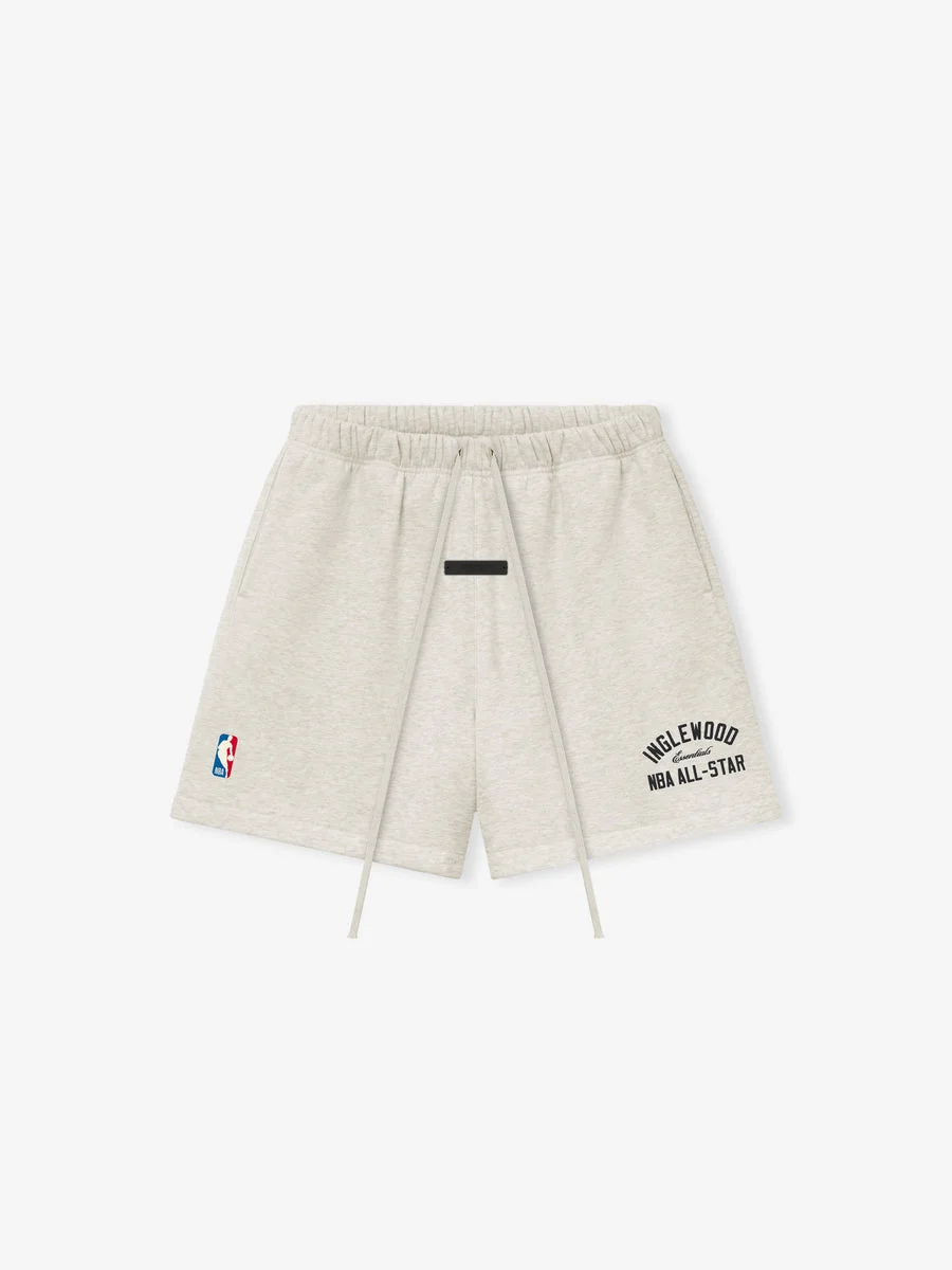 The Inglewood NBA All-Star Classic Sweatshort is crafted from 520gsm heavyweight cotton fleece, offering both structure and body to its signature, relaxed leg. The leg features a puff-printed INGLEWOOD NBA ALL-STAR lockup paired with the official NBA logo. Finishing details include an encased elastic waistband with elongated drawcords, side seam pockets, and a Fear of God Essentials label is at the center front.