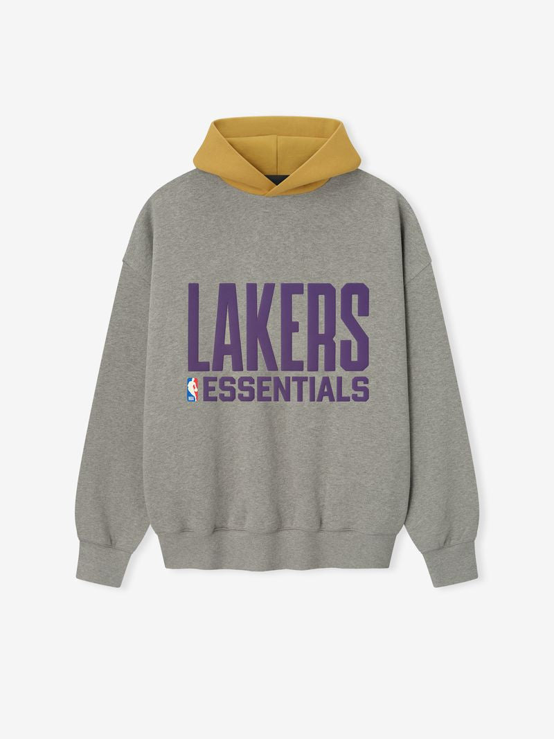 The Lakers Sport Hoodie is crafted from core fleece, offering an elevated balance of softness, structure, and lasting comfort. Cut in a relaxed sport fit, it drapes with more ease through the body and extended length compared to the Essentials classic silhouette. The front features a bold puffer-print graphic "Lakers Essentials " alongside the authentic NBA logo, while the back showcases the "Los Angeles" logo. Additional features include contrasting hood, side pockets, rib-knit at the cuffs and waist hem. The signature rubberized Fear of God Essentials label accents the hood.